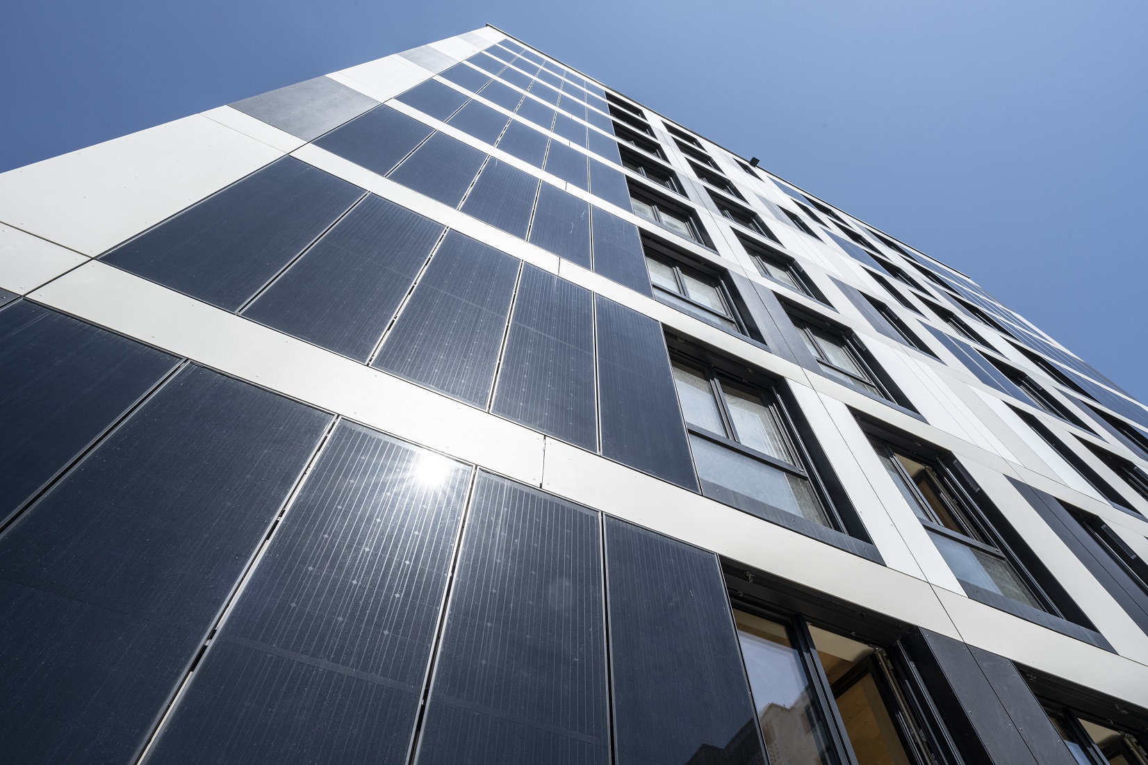Ein prägnanter Look der Gebäudehülle ist nicht nur dem gehobenen Wohnungsbau vorbehalten. Herausragendes Beispiel für eine gelungene Fassadengestaltung im bezahlbaren Wohnungsbau ist ein neungeschossiges Holzhybridgebäude. Mit praktisch wartungsfreien Fassadentafeln aus Faserzement gelingt dabei der Spagat zwischen hochwertigem Design und hoher Wirtschaftlichkeit.
